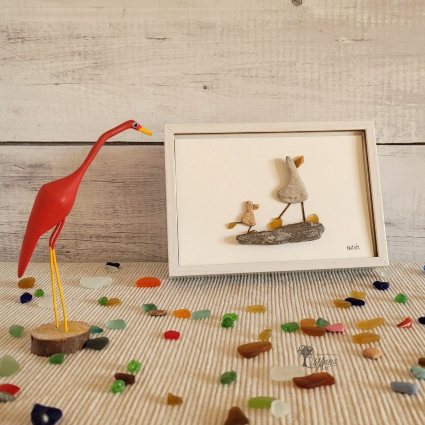El cuadro con piedras «Cuack, cuack», está hecho a mano en Barcelona con guijarros, piedras, ramitas, cristales del mar y algún trazo de rotulador.