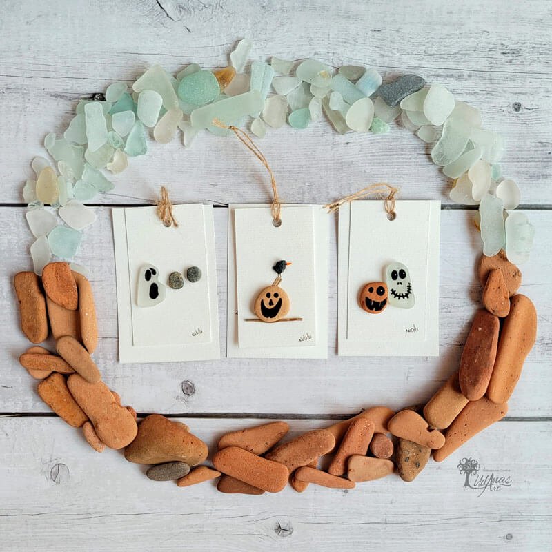 El cuadro con piedras «Halloween», está hecho a mano en Barcelona con piedras, maderas de deriva, ladrillos y cristales del mar, pelo de coco, acrílicos y algún trazo de rotulador.