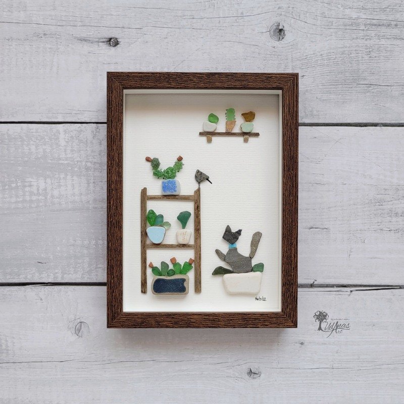Este cuadro con piedras «Miau», es un detalle de decoración original, perfecto para regalar a personas amantes de los gatos y las plantas.