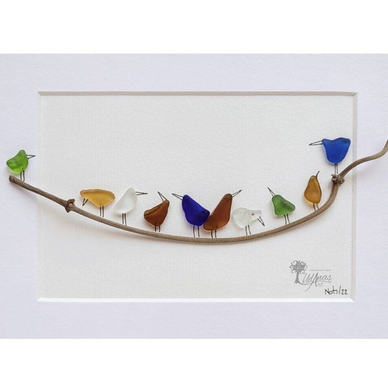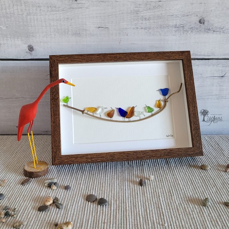 Este cuadro con piedras «Reunión de vecinos», con pájaros de colores, es un regalo original para decoración del hogar, en cualquier época del año.