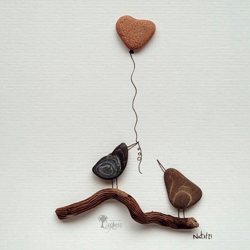 El cuadro con piedras «Te quiero», está hecho a mano en Barcelona con guijarros, madera de deriva, ladrillo del mar y algún trazo de rotulador.