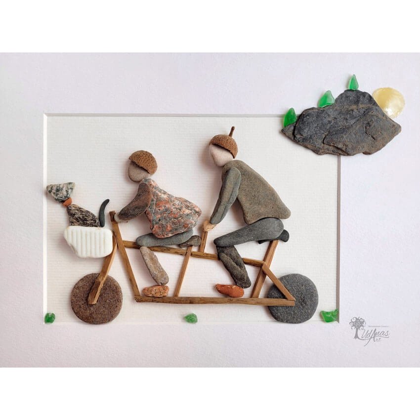 El cuadro con piedras «Atardecer en bicicleta», está hecho a mano en Barcelona.