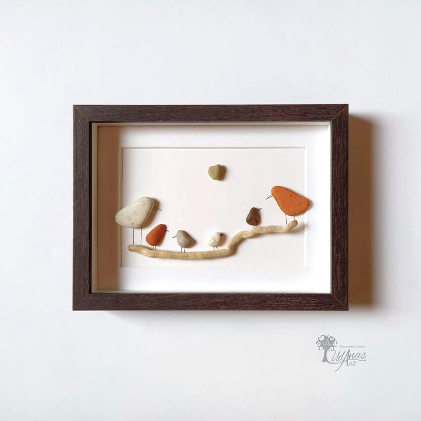 Este cuadro con piedras «Aprendiendo a volar con los abuelos»