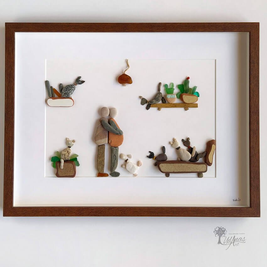 El cuadro con piedras «Chicos, crece la familia», está hecho a mano en Barcelona.
