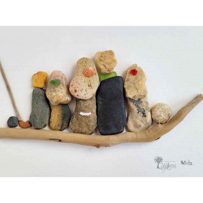 El cuadro con piedras «Familia Finlandia», está hecho a mano en Barcelona con materiales recogidos del suelo: piedras, guijarros, madera de deriva, conchas marinas, azulejos.