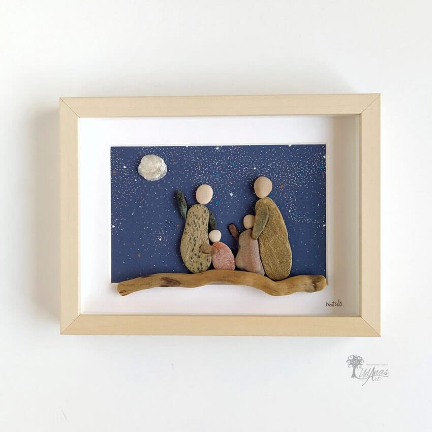 El cuadro con piedras «Mirando la luna», está hecho a mano en Barcelona.