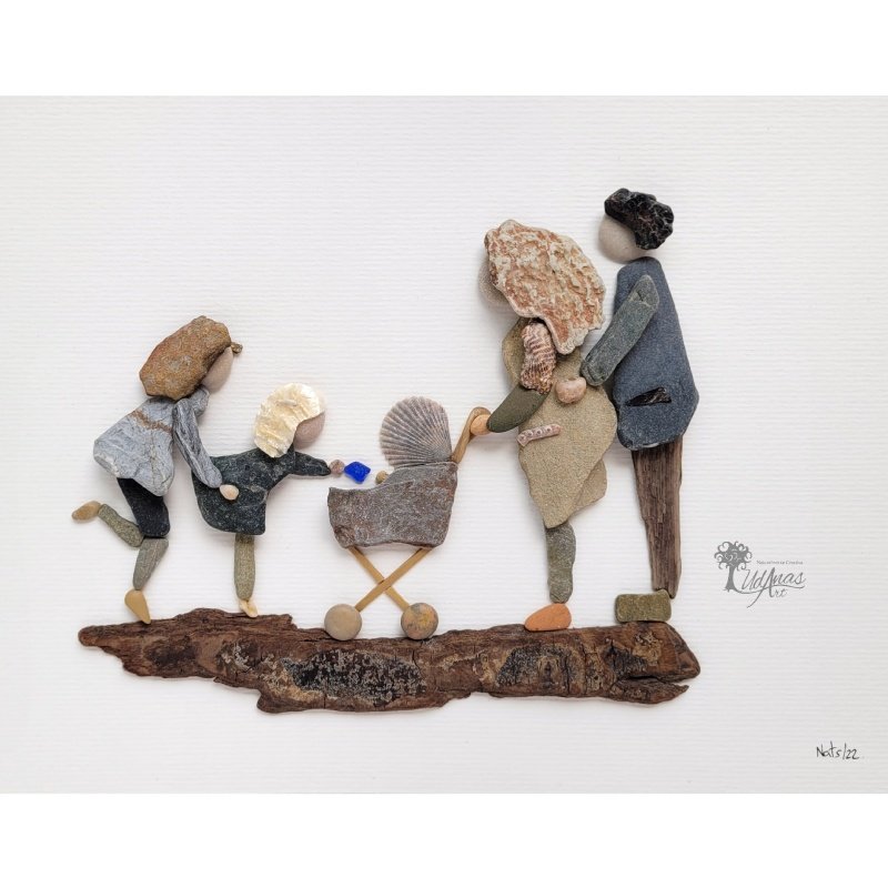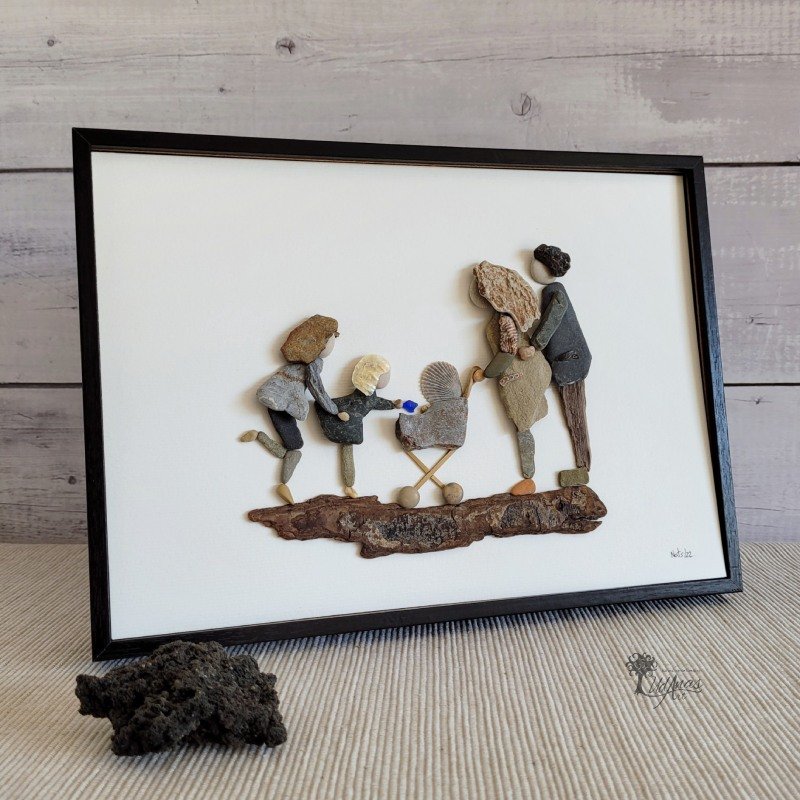 El cuadro con piedras «Nuestra gran Victoria», está hecho a mano en Barcelona, con guijarros, piedras, conchas marinas, cristal del mar y madera de deriva.