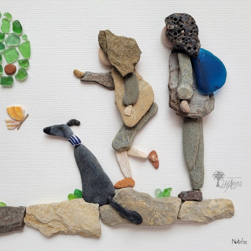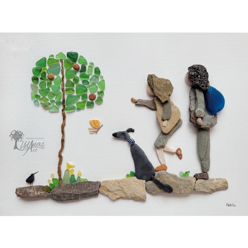 El cuadro con piedras «Passejant amb la Candela», está hecho a mano en Barcelona con materiales recogidos del suelo: piedras, guijarros, azulejos, conchas marinas, cristales del mar, corteza de hueso, ramita seca, etc