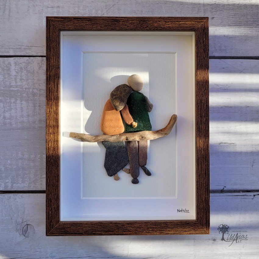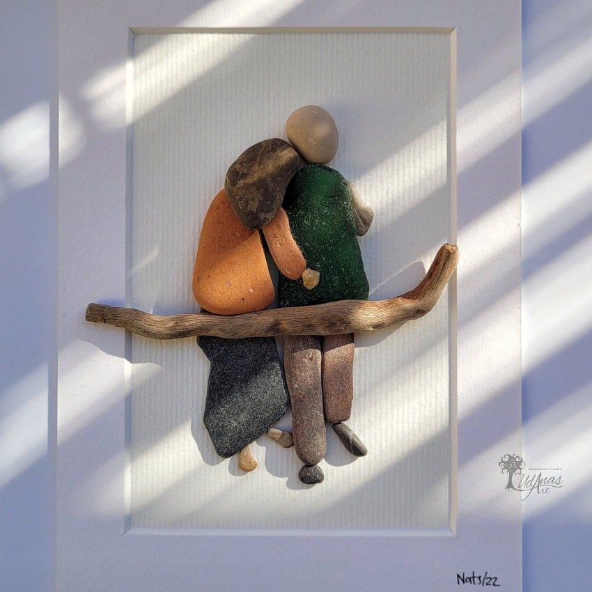 El cuadro con piedras «Tú y yo», está hecho a mano en Barcelona con guijarros, piedras, madera de deriva, ladrillo y cristal del mar.