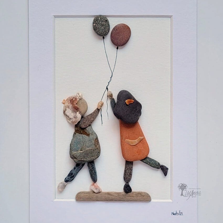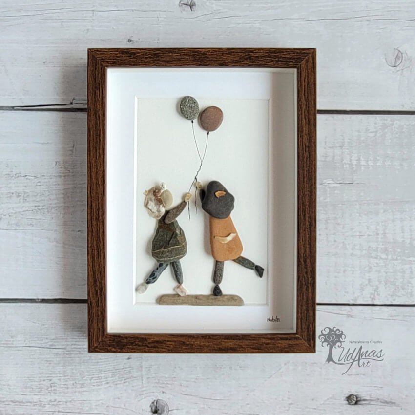 El cuadro con piedras «Amigas para siempre», está hecho a mano en Barcelona con guijarros, piedras, ladrillos, cristales del mar, maderas de deriva, conchas marinas y algún trazo de rotulador.