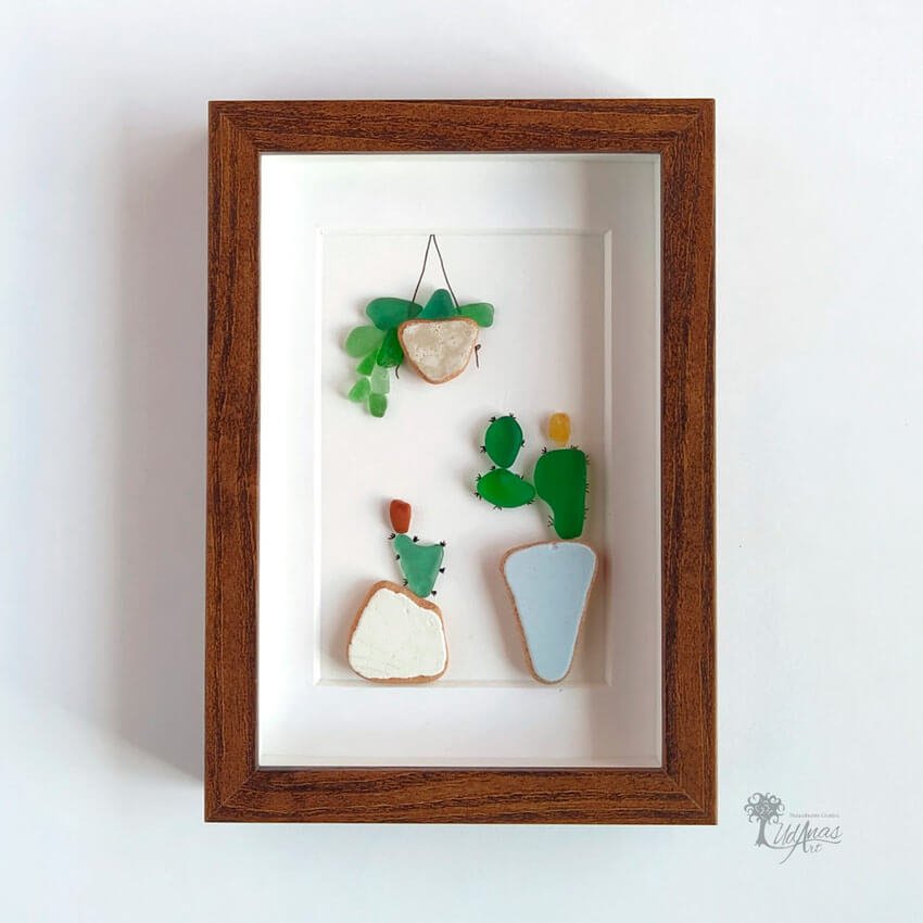 El cuadro con piedras «Cactus», está hecho a mano en Barcelona con cristales de mar, azulejos, ladrillos del mar y algún trazo de rotulador.