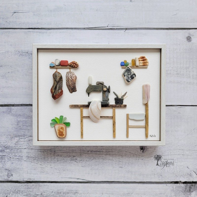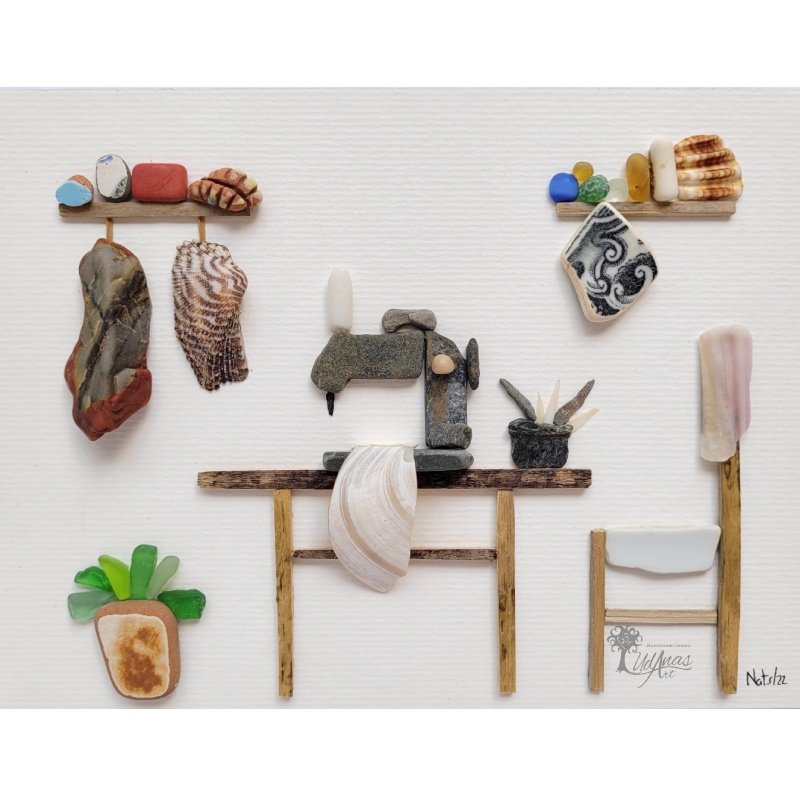 El cuadro con piedras «Coser y cantar «, está hecho a mano en Barcelona con piedras, guijarros de playa, madera de deriva, conchas marinas, azulejos, ladrillos y cristal de mar.