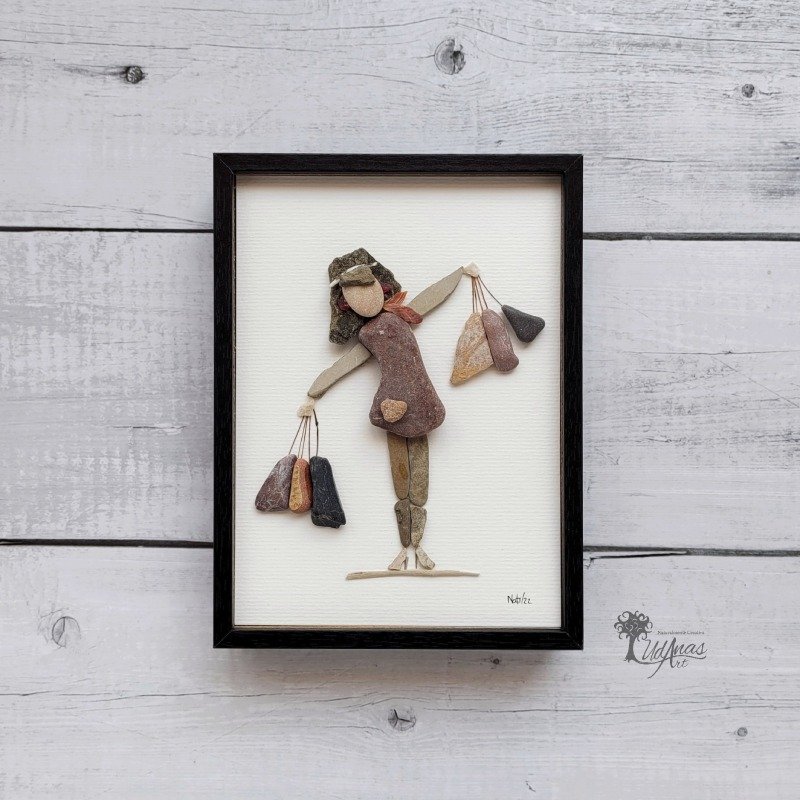 El cuadro con piedras «De shopping», está hecho a mano en Barcelona con materiales recogidos del suelo: guijarros de playa, piedras, conchas marinas, madera de deriva y pelo de coco.