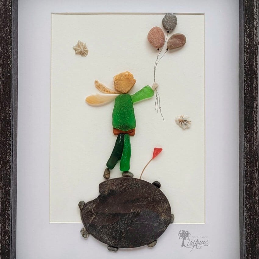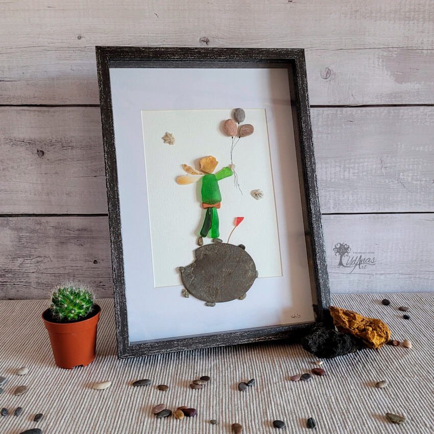 El cuadro con piedras «El Principito», está hecho a mano en Barcelona con guijarros de playa, piedras, ladrillo, cristales de mar, conchas marinas y algún trazo de rotulador.