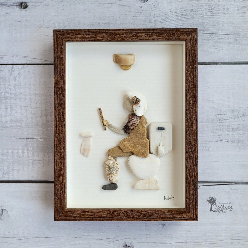 El cuadro con piedras «Mi refugio», está hecho a mano en Barcelona con materiales recogidos del suelo: piedras, guijarros de playa, maderas de deriva, conchas marinas, azulejos y corteza de hueso.