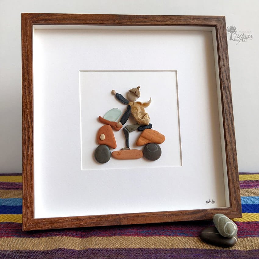 El cuadro con piedras «Motorizado», está hecho a mano en Barcelona con guijarros, piedras, ladrillos, cristales del mar, concha marina y capuchón de bellota.