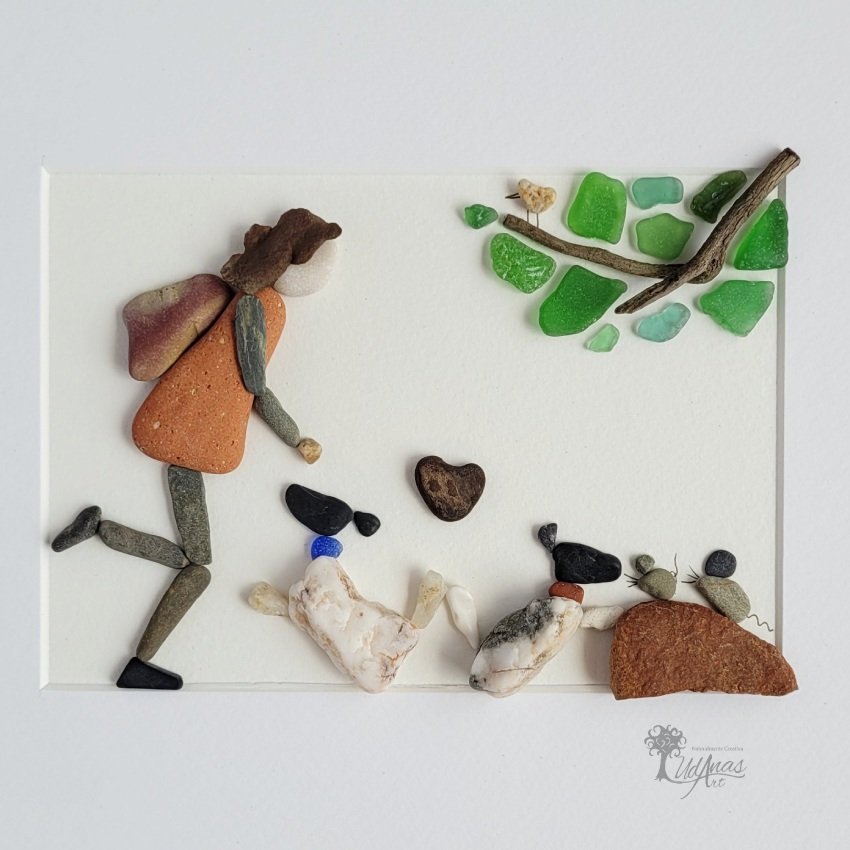 El cuadro con piedras «Carol, Thelma and Louise», está hecho a mano en Barcelona con guijarros, piedras, maderas de deriva, ladrillos, cristales del mar, corteza de árbol y algún trazo de rotulador.