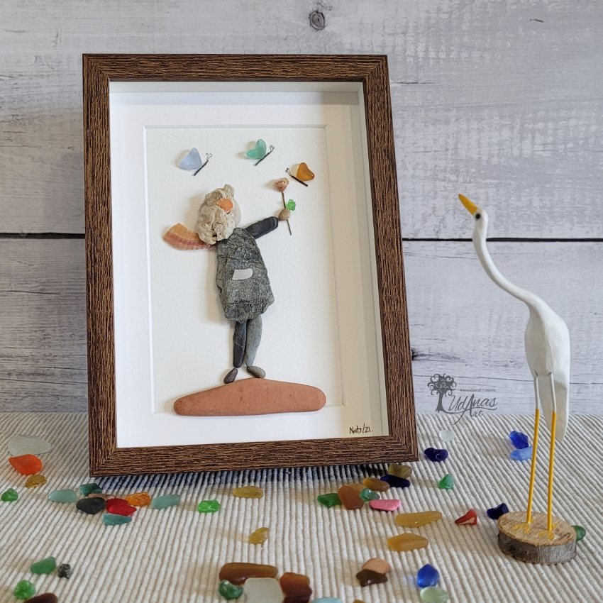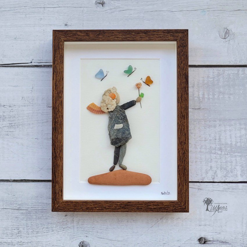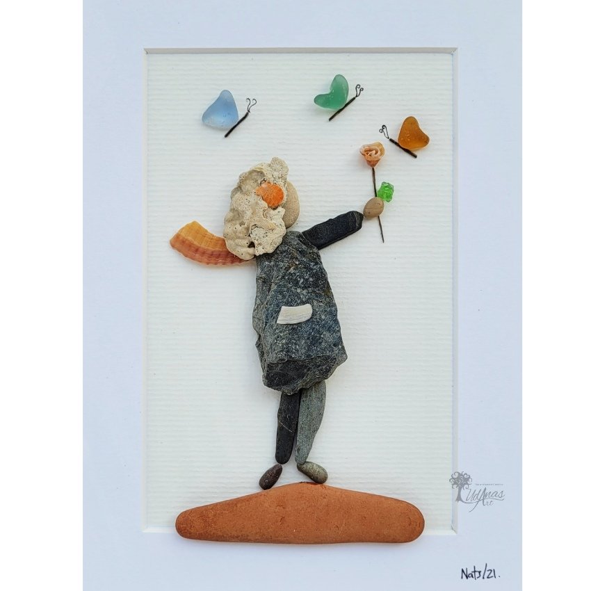 El cuadro con piedras «La danza de las mariposas», está hecho a mano en Barcelona con guijarros, maderas de deriva, ladrillos, cristales del mar y algún trazo de rotulador.