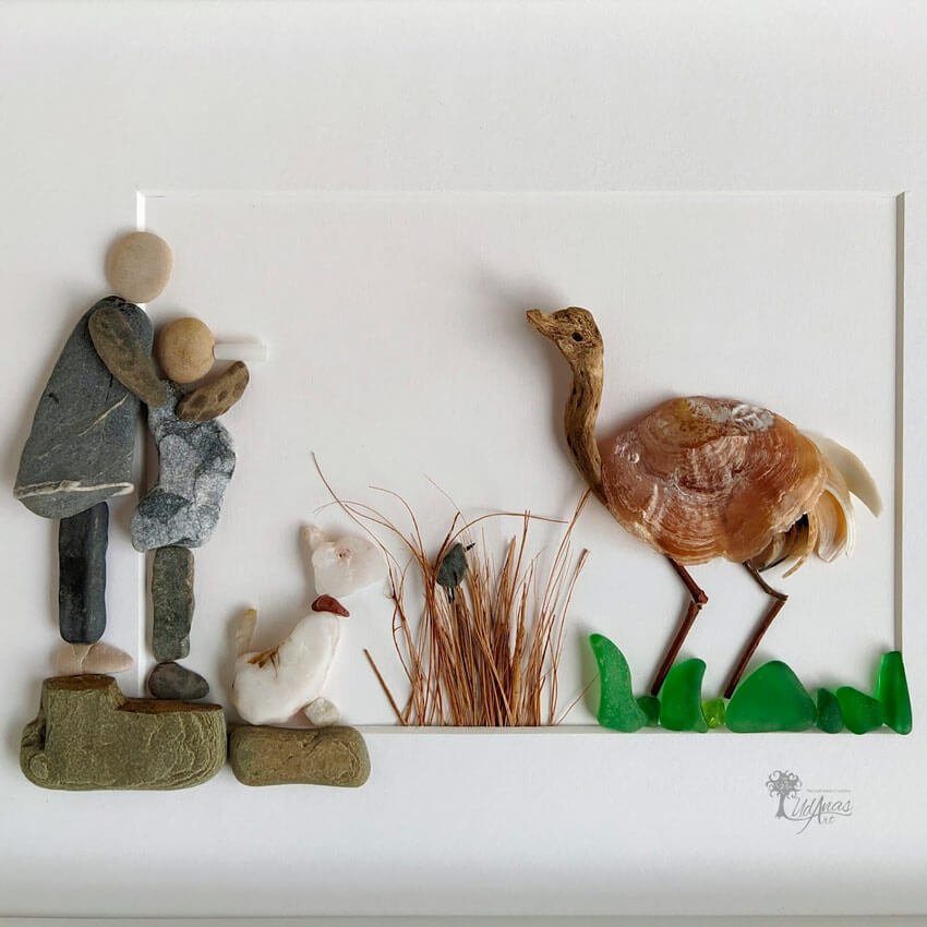 El cuadro con piedras «Migración de las grullas», está hecho a mano en Barcelona con guijarros, conchas marinas (dentalium shells), ladrillos y cristales del mar, pelos de coco, madera de deriva y ramitas secas.