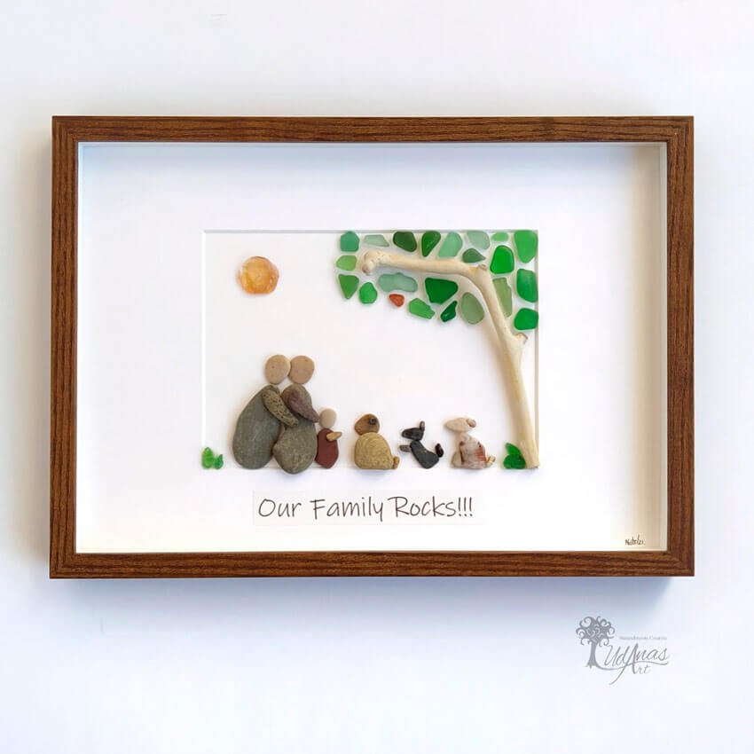 El cuadro con piedras «Our family rocks», está hecho a mano en Barcelona.